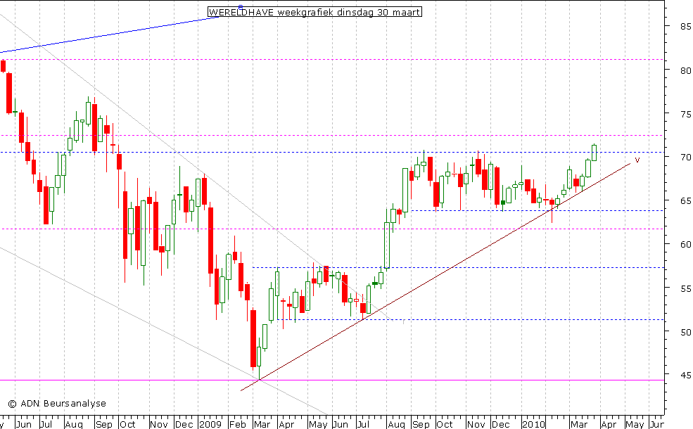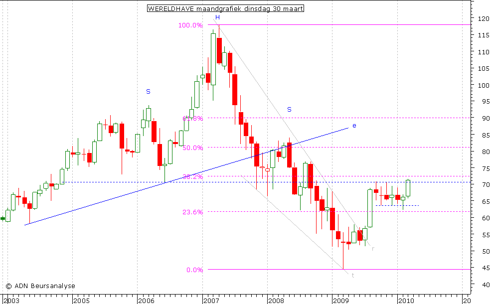 Wereldhave boven 70,50 en lijn w blijft. Een terugkeer binnen het gebied 63,75 - 70,50