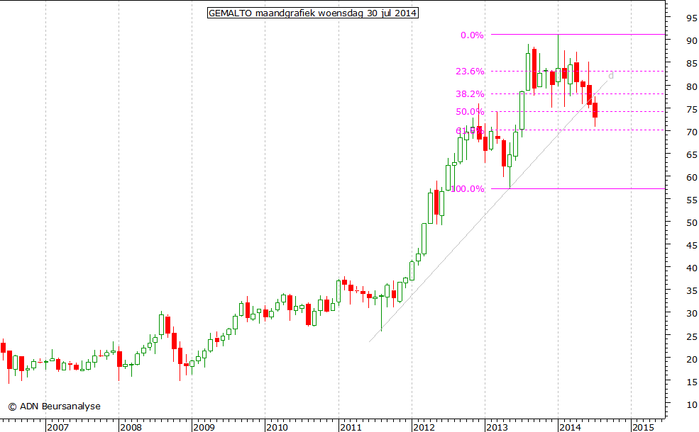 onder de recente bodem rond €70,90 en het 61,8% niveau