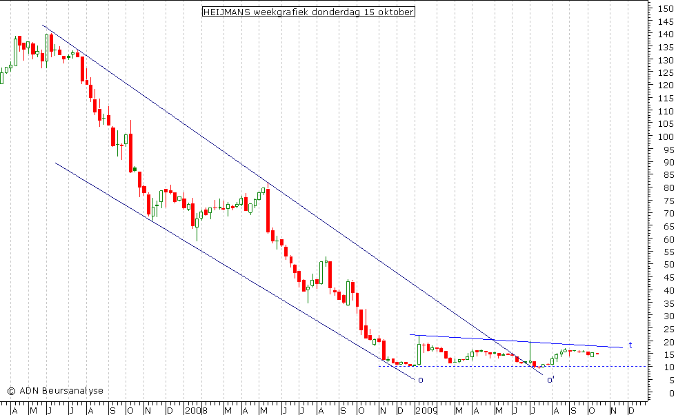 weekgrafiek de dalende trend zoals weergegeven door het trendkanaal o-o'