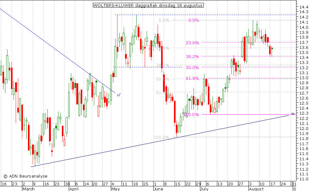 de andere stippellijnen. Het grijze 61,8% niveau rond €12,70 is bepalend