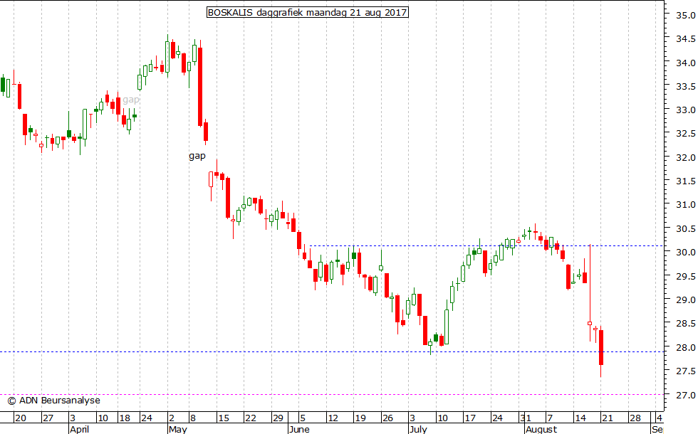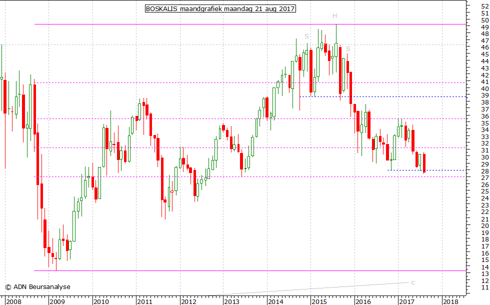 weekgrafiek van Boskalis is zorgelijk. De bodem rond 25 uit