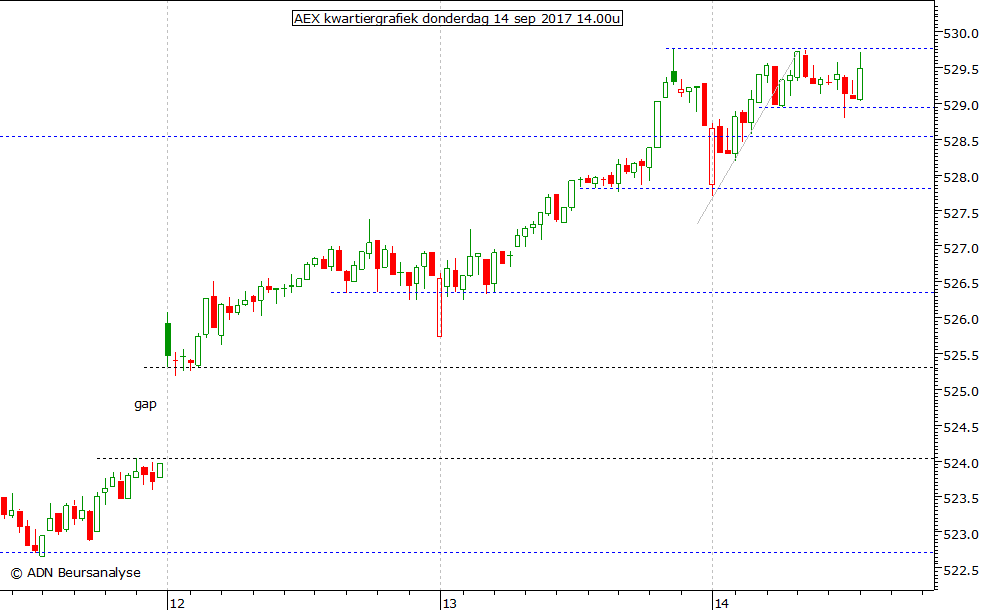 het moment dat de markt met een stijging boven 529,8 of een daling onder
