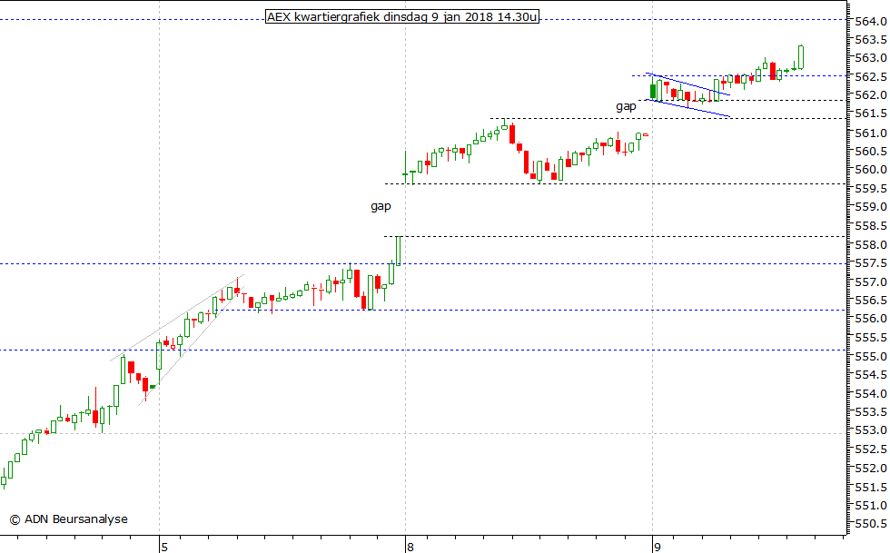 naar boven voor in de 1 minuut grafiek van de AEX index. Met het laatste