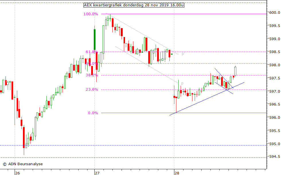 een top kan ontstaan. Het 61,8% niveau rond 598,5 is een grens waar dat