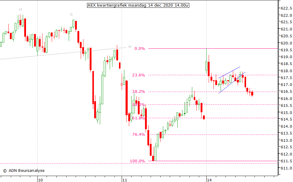 50% niveau rond 615,5, het 61,8% niveau rond 614,6 en het 76,4% niveau rond