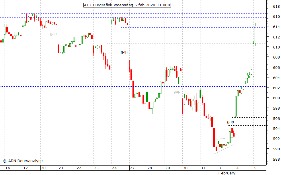 dus in feite. De AEX is terug bij de stippellijn rond 613,8, waarmee het