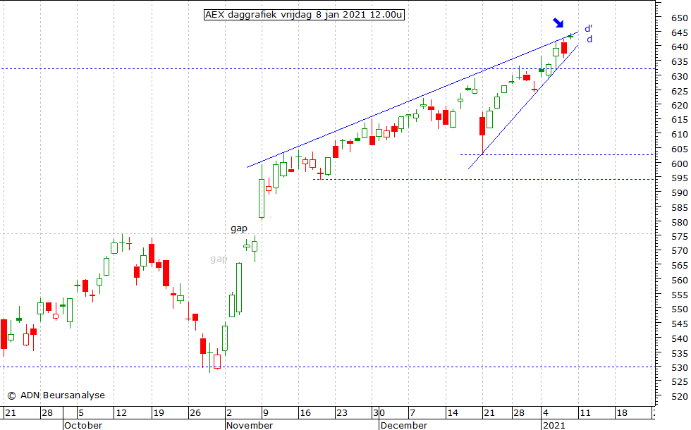 beeld in de daggrafiek, waarin vandaag een uitbraak naar boven uit de wig in