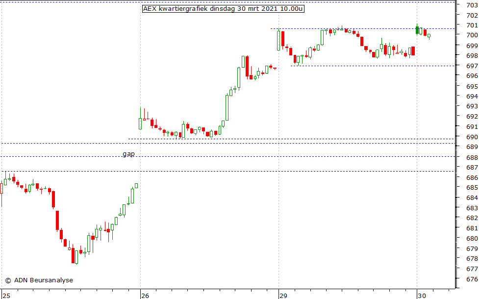 Vanmorgen keerde de AEX index terug bij de toppen die gisteren tussen 700,6 en 700,9 tot stand kwamen. De
