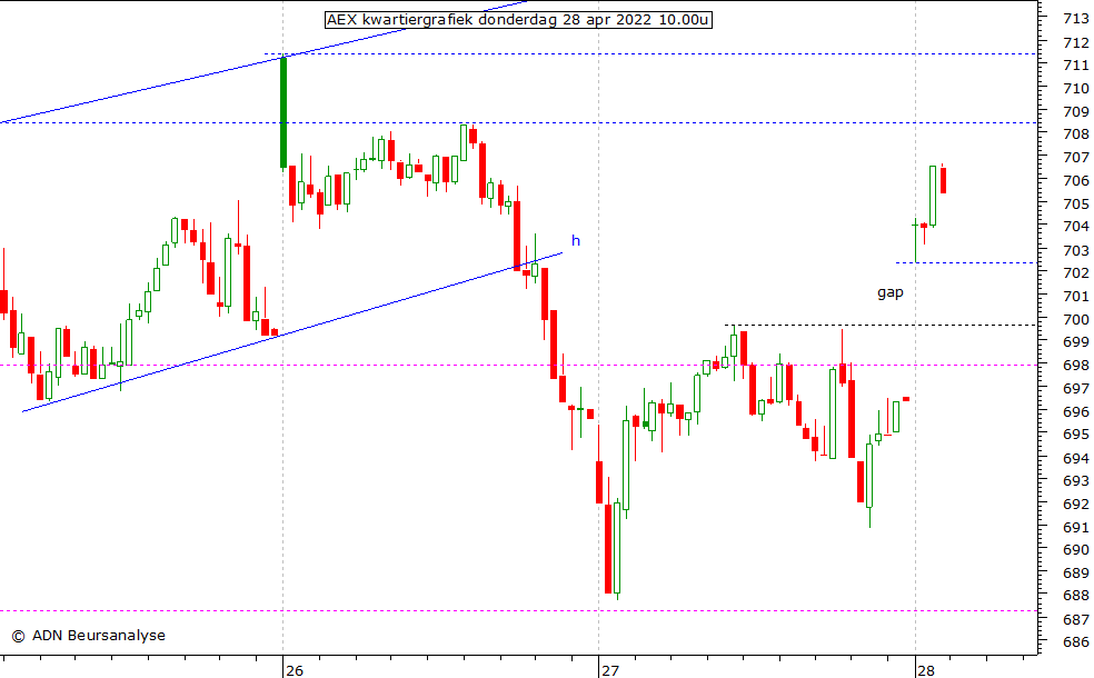 kwartiergrafiek. De AEX stijgt na tienen. Weerstand kan er zijn rond 708,4