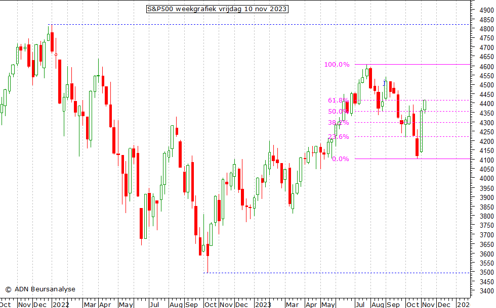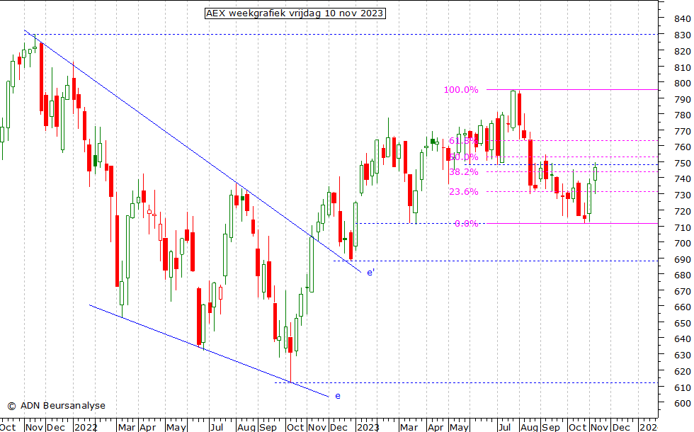 van de AEX index, namelijk de weekgrafiek. Een paar weken