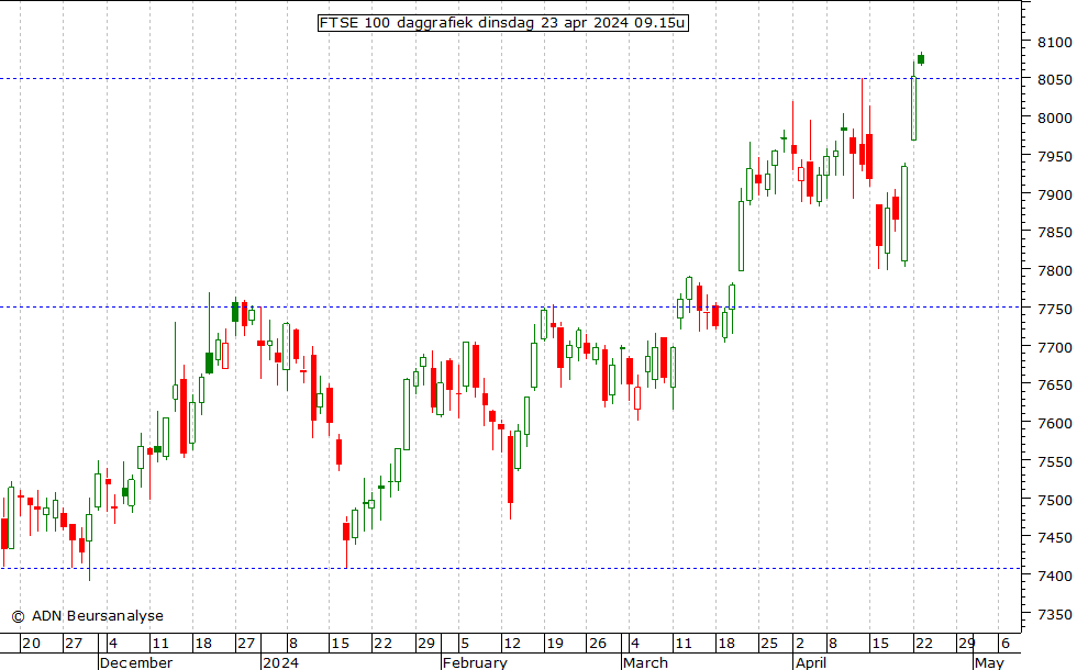 gisteren door de top rond 8.050 uit februari 2023 en bereikte