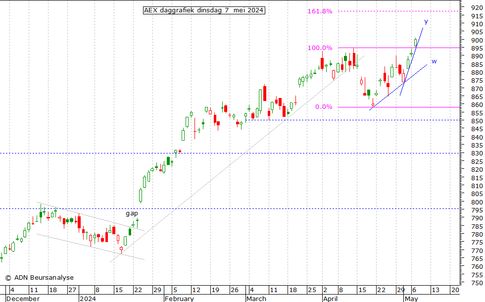 niveau van de daling 894,5 - 858,1 rond 917 het koersdoel. Zolang de AEX