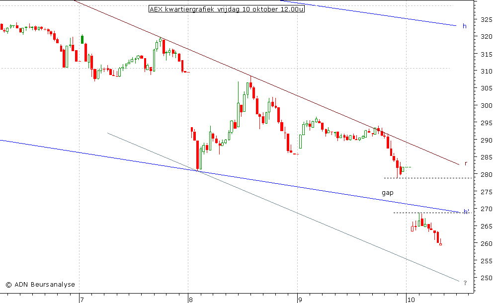 • Het leek er een half uur geleden even op dat de aandelenmarkt een bodem probeerde te maken, er ontstond namelijk een hammer. Deze poging was echter maar van korte duur. De hammer werd onmiddellijk gevolgd door een daling, waardoor de AEX-index de neerwaartse beweging aanhield. We bewegen nog steeds in de richting van de grijze (voorlopige) lijn die ik vanmorgen parallel aan lijn r tekende.